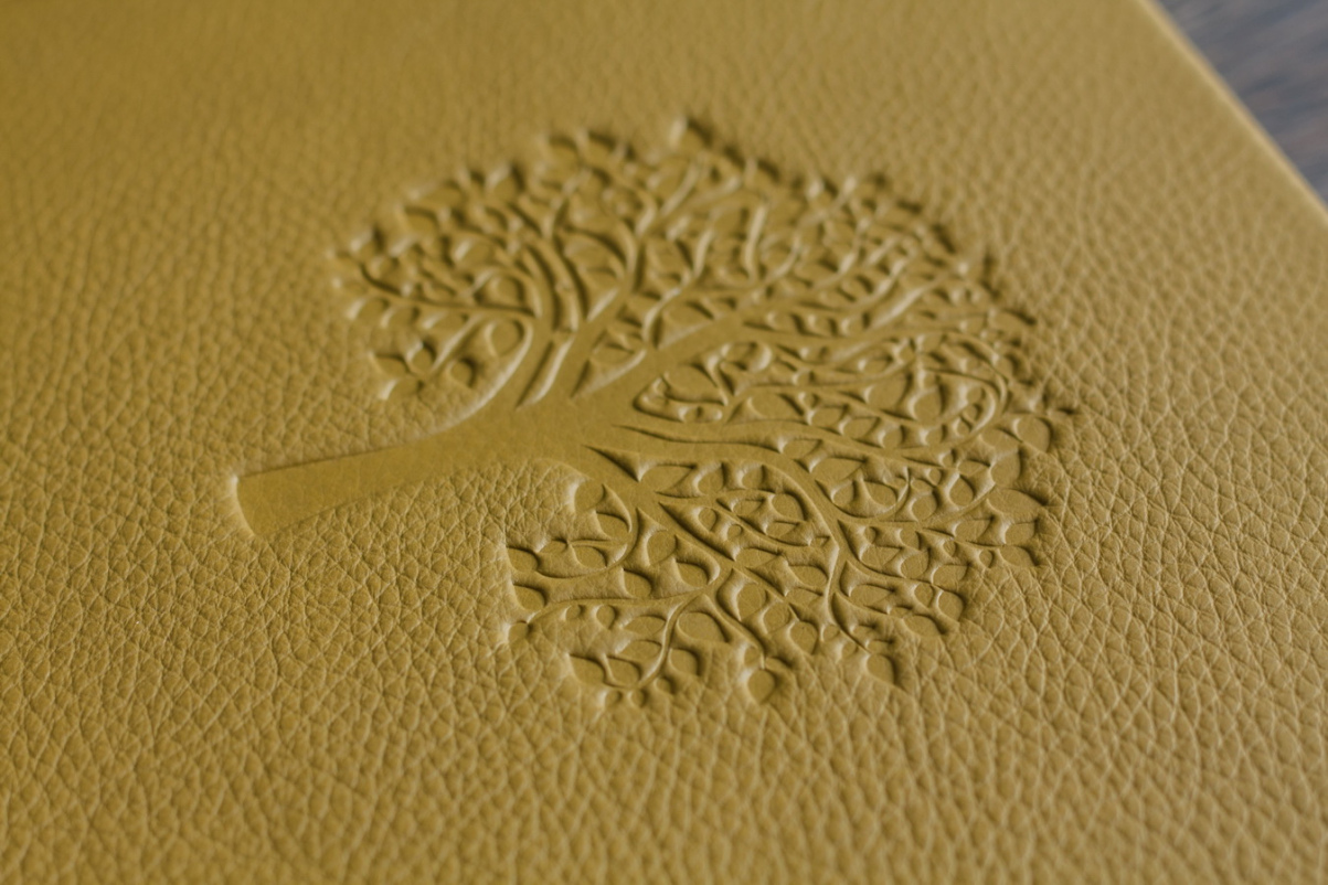 1. слепое (блинтовое). В процессе тиснения происходит изменение текстуры материала самого изделия, оставляя на поверхности плоское углубление Это делает надпись более устойчивой к истиранию и повреждениям, так как уровень тисненого изображения находится ниже основного уровня материала. чем и объясняется долговечность этого вида нанесения. Оно не сотрется и не потрескается. Получается плоский бескрасочный вогнутый оттиск. Этот вид тиснения используется при изготовлении папок, ежедневников, планнингов из кожи и кожзаменителя. Изображение, нанесенное слепым методом, подходит для компаний, которые придерживаются более строгого и сдержанного стиля.